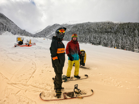 Grupa de incepatori striga prezent la apel la ora 10 la statia gondola si avea dedicata 3 ore de teorie si practica pe partie, invatand lectiile de baza, de la cum sa nu piarda placa pe partie la virajele de incepatori.